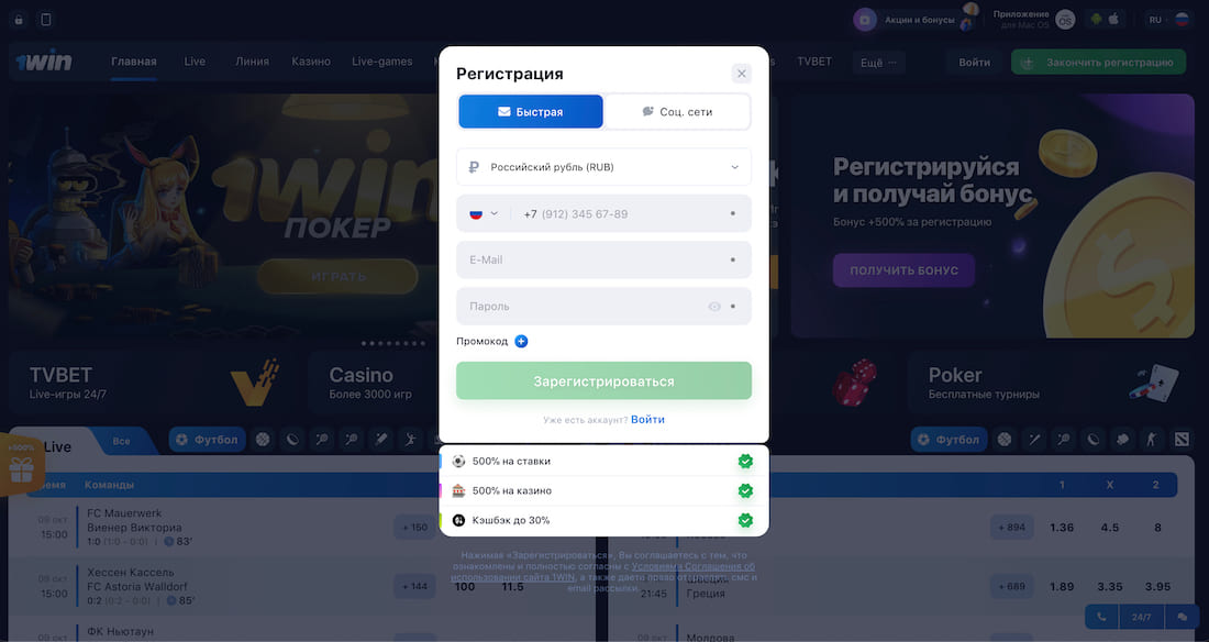 На платформе 1вин предусмотрено три удобных способа создания аккаунта:
