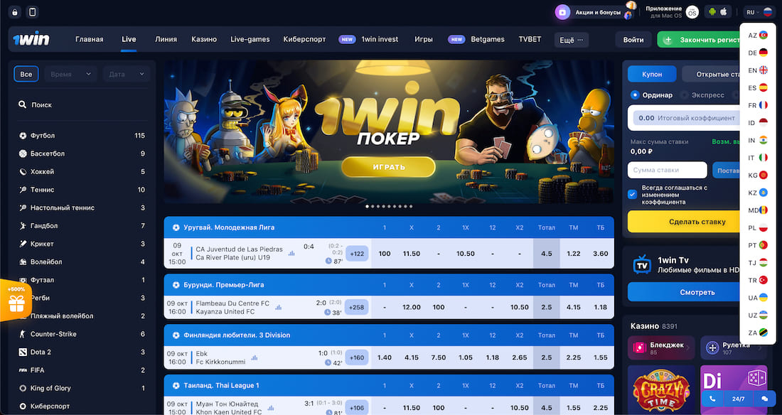 Букмекерская контора 1 вин предоставляет доступ к широкой линии спортивных событий. Здесь можно делать ставки на классические виды спорта, такие как футбол и теннис, а также на более редкие дисциплины, например, керлинг. Популярные матчи сопровождаются прямыми трансляциями, что позволяет делать ставки в режиме live и добавляет игре эмоций.